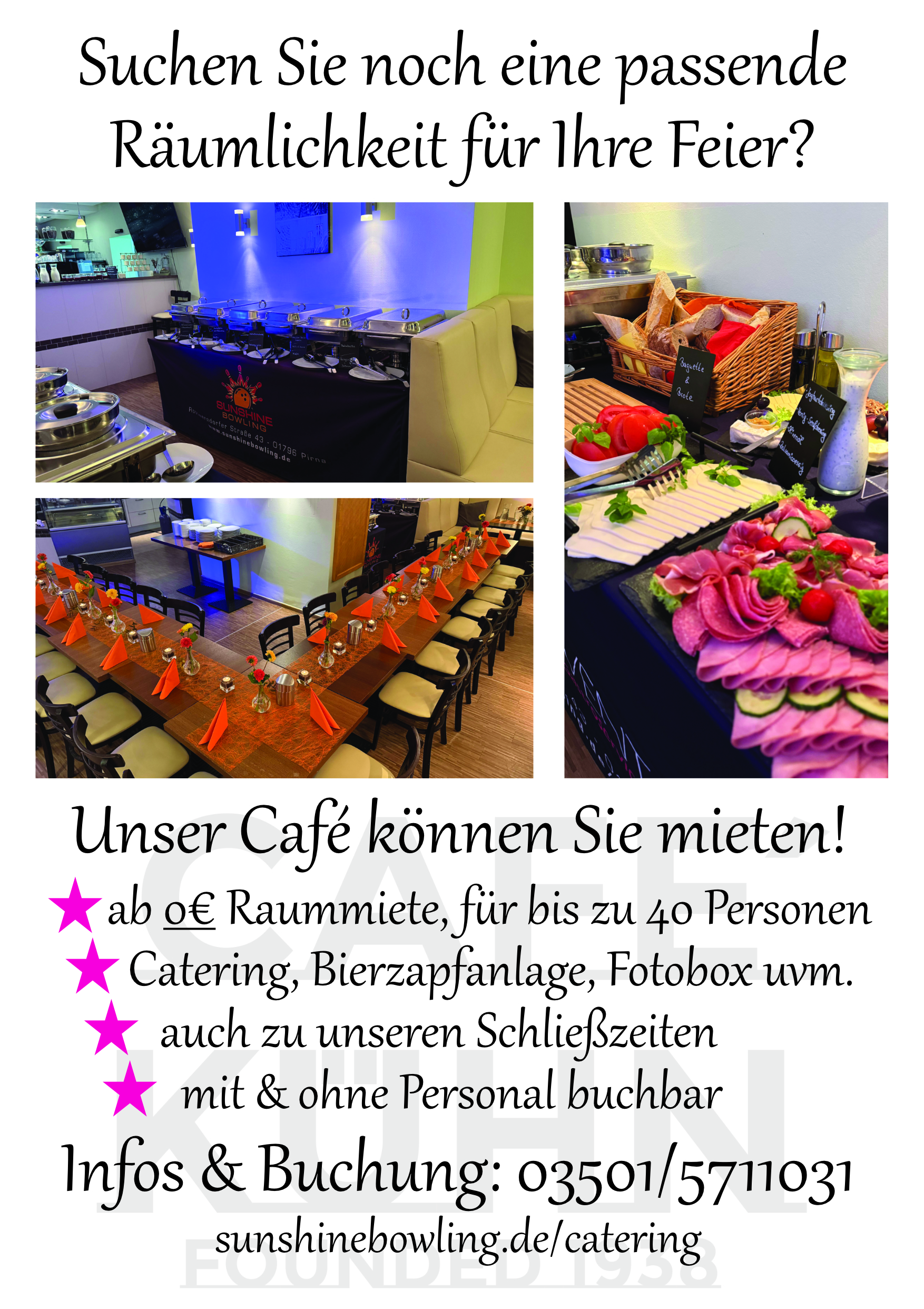 Wir nehmen ebenfalls Reservierungen für unser Café entgegen, auf Wunsch mit einem Buffet unserer Partnerfirma Koserevent, welches wir Ihnen vor Ort liefern und aufbauen. Reservierungen für schöne, lustige oder auch traurige Anlässe nehmen wir unter 03501/57 11 031 oder über unser Reservierungsformular entgegen.