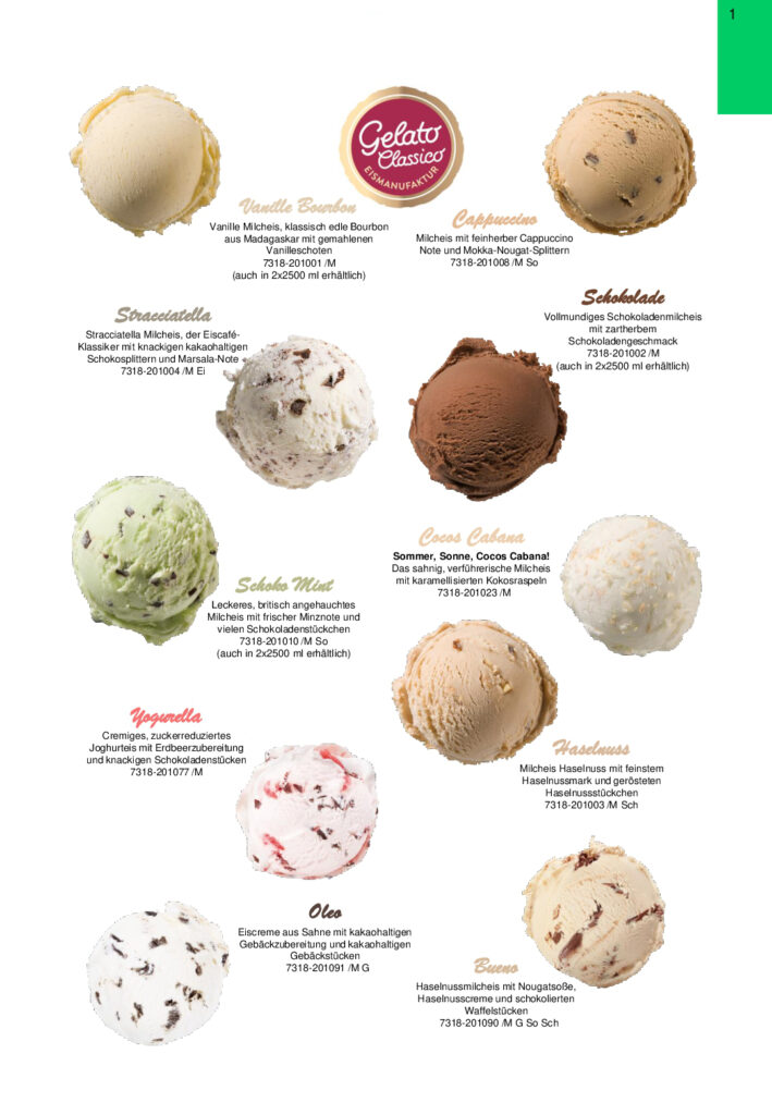 Folgend sehen Sie das gesamte Eissortiment unseres Anbieters Gelato Classico. Wir freuen uns über Ihren Vorschlag!