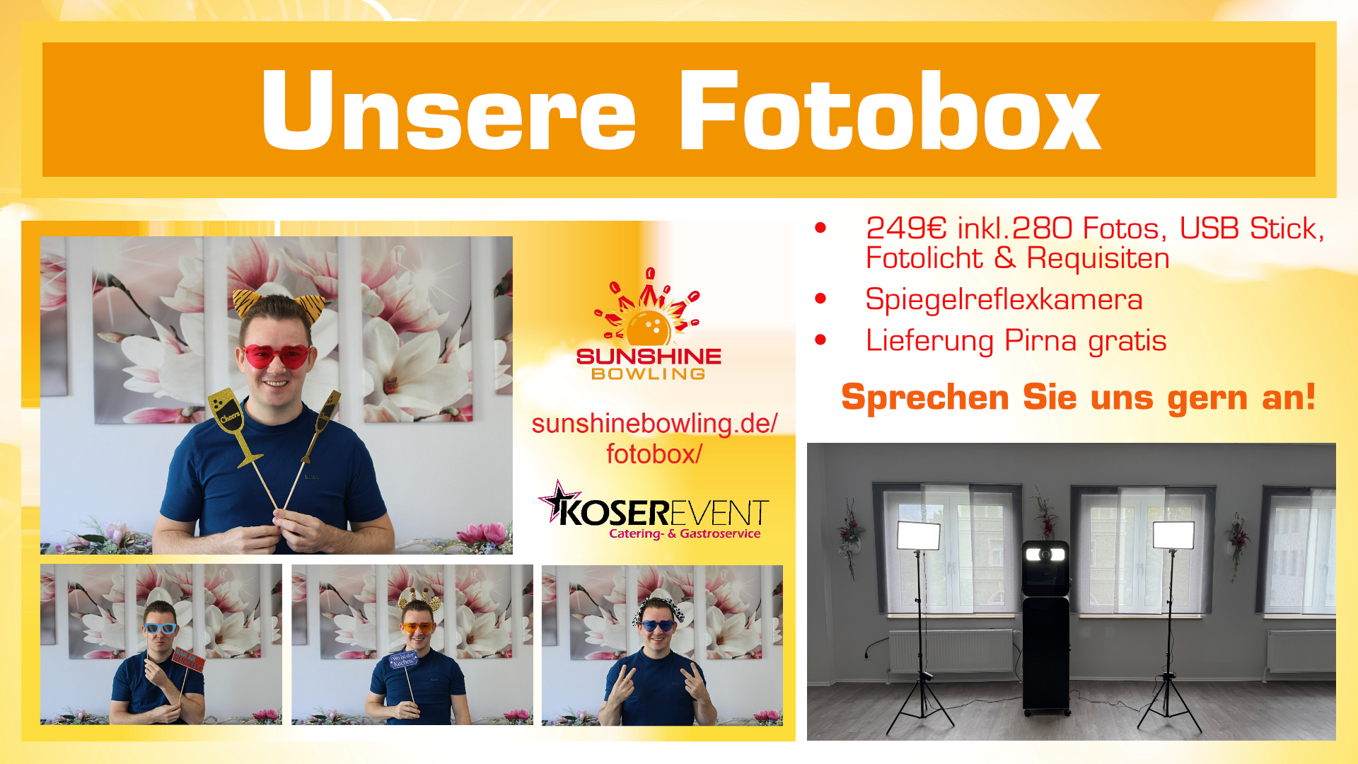 Keine versteckten Kosten! Fotobox, Aufbau, Abbau, USB-Stick, Fotolicht, Requisiten, mindestens 280 Ausdrucke für 249€. Lieferung Pirna gratis, außerhalb auf Anfrage. Bei Außerhausaufträgen wird der Unterbau durch einen stabilen Alurahmen ausgetauscht. Wir freuen uns auf Ihre Anfrage!